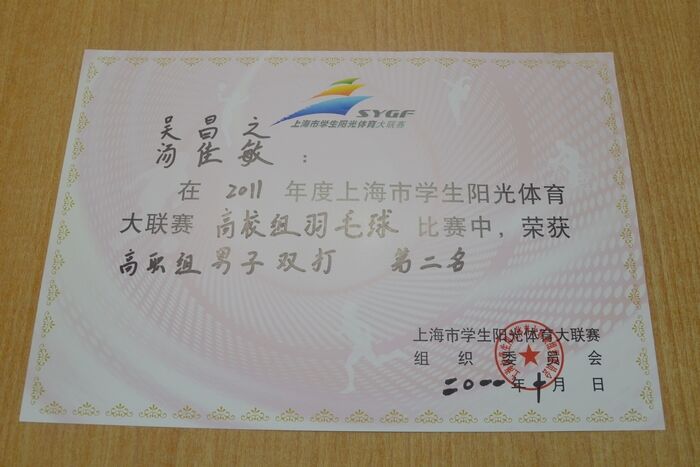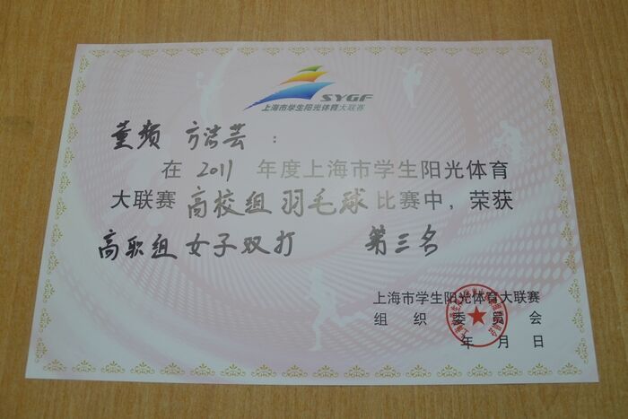 经济系10金融管理与实务吴昌文、艺术系10室内设计汤佳敏荣获上海市阳光体育大联赛高校羽毛球赛暨上海市大学生羽毛球锦标赛高职组男子双打第二名。