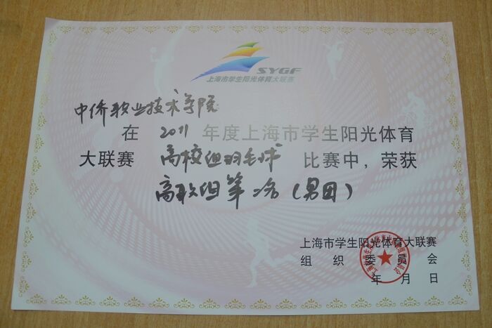 艺术系10空间设计王海晨、经济系10金融管理与实务吴昌文、艺术系10室内设计汤佳敏、艺术系10美术设计徐超等、管理系11物流管理卜志雨荣获上海市阳光体育大联赛高校羽毛球赛暨上海市大学生羽毛球锦标赛高职组男团第二名。
