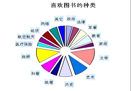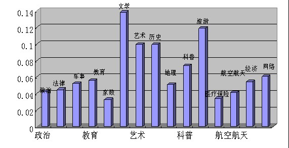表一 1.从表一中可以看出,首先就同学们喜欢的图书类型,13.39%同学喜欢文学类书籍,11.40%同学喜欢旅游方面的书籍,9.69%同学喜欢艺术方面的书籍,9.32%的同学喜欢历史方面的书籍7.59%的同学喜欢科普读物。由图可以看出同学们课余读书种类比较丰富。大多数的同学更偏于喜欢文学、旅游、艺术、科普类、历史类的书籍。