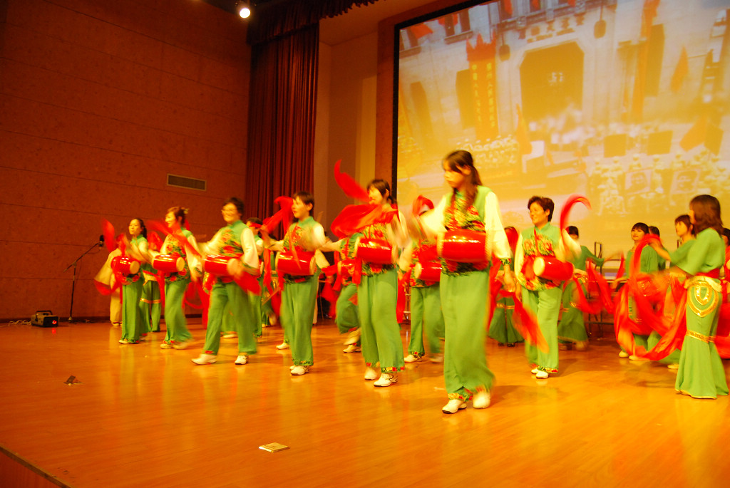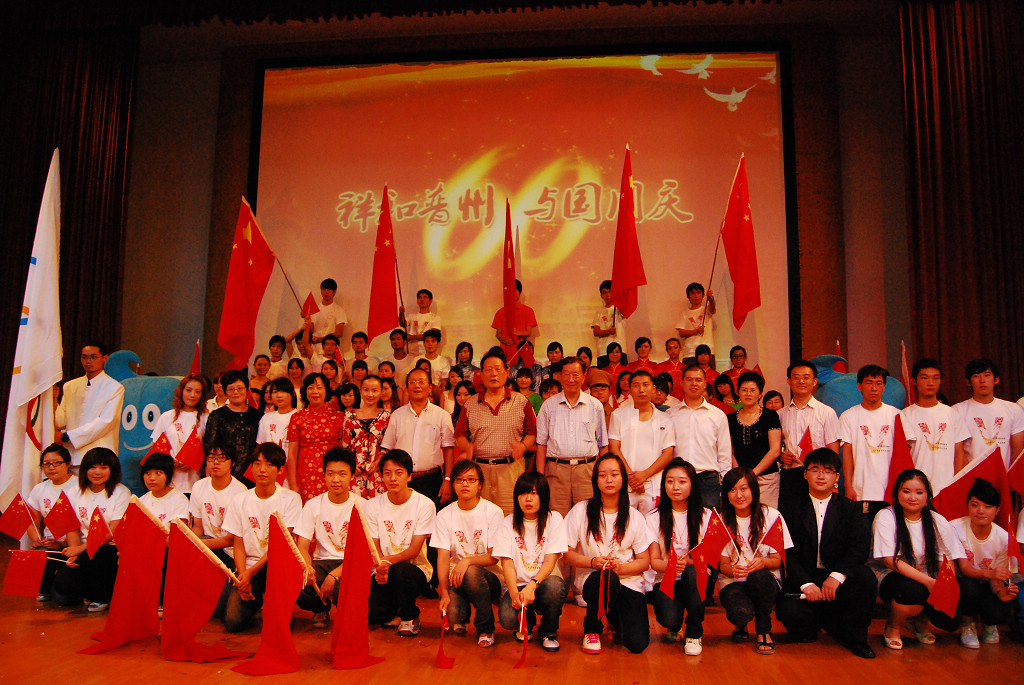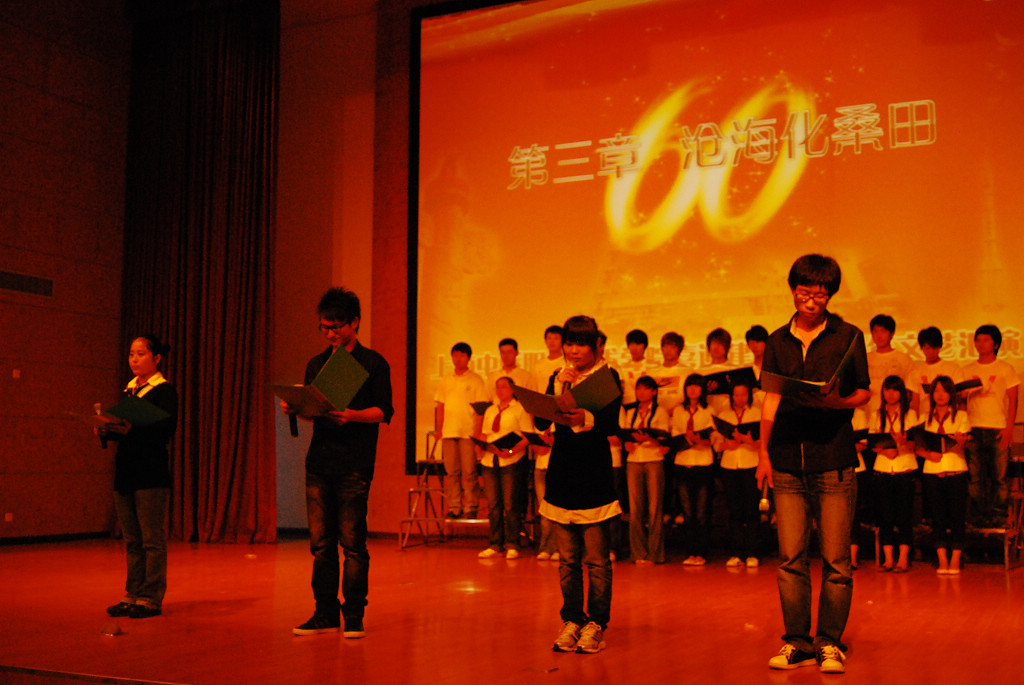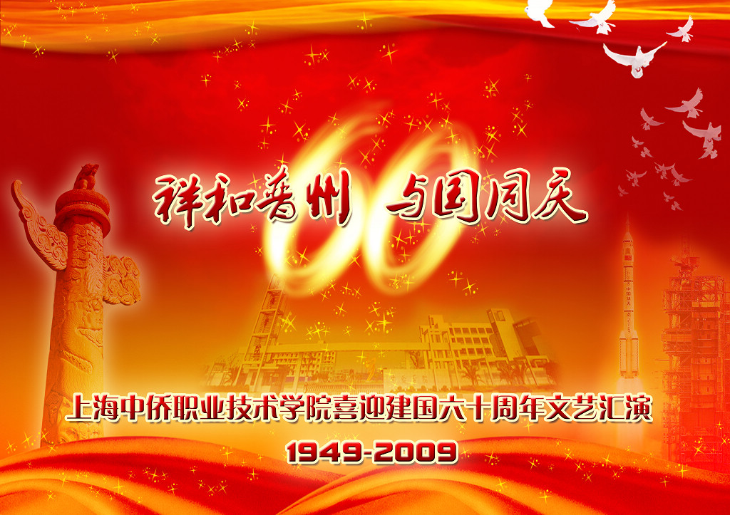 祥和普州,与国同庆六十载奋斗创业,一甲子春华秋实。伟大的中华人民共和国迈着雄健的步伐,走过了60年光辉历程,迎来了60华诞。9月25日下午,“祥和普州,与国同庆”上海中侨职业技术学院喜迎建国60周年文艺汇演在学院综合B楼四楼大礼堂隆重举行。本次汇演由学院工会、团委、妇工委、青联、学生会共同主办。学院董事长严红娟女士,学院党总支书记、院长潘日芳教授,康桥镇人民政府副镇长王建宏,学院创始人之一、原院长童宪刚教授等学院领导与嘉宾,以及800多名师生共同观看了精彩的文艺汇演。建桥学院、上师大天华学院、立达学院、欧华学院等兄弟学校负责人也应邀观看了文艺汇演。文艺汇演的第一篇章“炮火的洗礼”,以一段可歌可泣的历史壮歌为主题。旗袍秀《风华年代》和歌舞情景《繁华上海》仿佛将我们带回来了30年代的旧上海,繁华都市,歌舞升平。大合唱《毕业歌》、《保卫黄河》,挥舞大刀的《浴血奋战》展现了当年烽火硝烟的战场上无数中华儿女不畏牺牲,用热血铸就了新中国的感人画面。文艺汇演的第二篇章“新中国的诞生”,以各族人民团结奋进共创新中国为主题。难忘60年前,五星红旗在天安门广场上冉冉升起的那一刻,神州大地和华夏各民族从此迈进了历史的新纪元。人们跳起秧歌,敲起锣鼓,《解放区的天》凤凰涅槃,欢天喜地。一曲《中国永远收获着希望》,唱出浴火重生后的生生不息,播种着理想,憧憬新中国美好的未来。文艺汇演的第三篇章“沧海化桑田”,以改革开放经济飞跃发展为主题。配乐诗朗诵《春天的故事》歌颂了党的十一届三中全会后,改革开放的春风掀起神州大地发展的浪潮,推动着中国进入一个崭新的时代。扇子舞《走进新时代》舞出了对祖国的爱,舞出了对新中国美好生活的祝福。文艺演出的第四篇章“为中国喝彩”,以圆梦北京奥运会和喜迎上海世博会为主题。歌舞《奥运畅想》再现中国人民实现百年奥运梦想的历史时刻,跳动的海宝伴着动感的音乐带着我们喜迎《青春世博》,共同寄予对2010上海世博会的美好期待。歌舞《红旗飘飘》将整个文艺汇演推向高潮,台上的演员和台下的观众和着优美得旋律,手舞鲜艳的五星红旗,大礼堂内汇成了一片红色的海洋。文艺汇演结束后,校领导和嘉宾登台与全体演员和观众一起齐唱《歌唱祖国》。中侨师生以奔放的歌舞抒发满腔豪情,祝福伟大祖国美好明天。