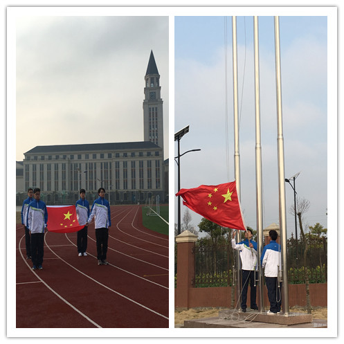 仪式一开始,在全体师生的注目礼下,英姿飒爽的国旗班的同学们护送鲜艳的五星红旗进场,随后,在雄壮的国歌中,鲜艳的五星红旗冉冉升起,全场师生庄严肃立,面向五星红旗行注目礼,深怀对祖国无限的热爱和崇高的敬意。