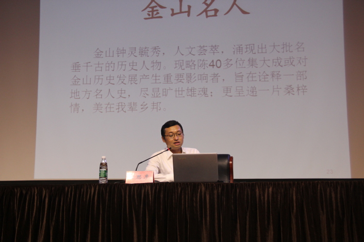 余老师旁征博引、深入浅出,通过形象生动的图片等资料介绍了金山历史悠久,6000年前即已成陆,有著名的马家浜文化和良渚文化遗址。古镇枫泾等有着深厚的吴越文化沉淀,金山卫抗日、张堰南社活动等影响巨大。