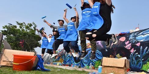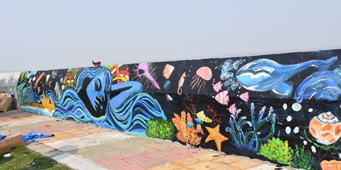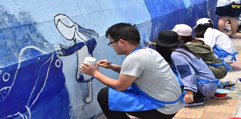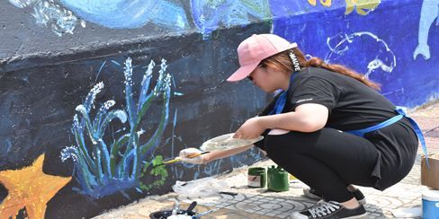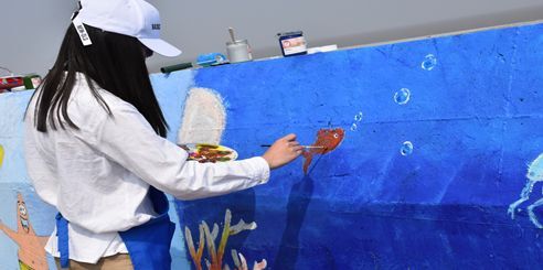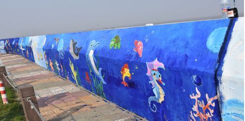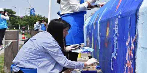 6月8日是世界海洋日,本次活动在全国”扬波大海,走向深蓝”这个大背景下开展以“青春之海”为主题的墙绘活动。应用艺术系30余名师生在上海市金山区海塘所的组织下来到金山嘴渔村防汛墙进行作画。