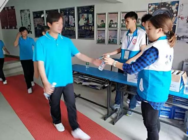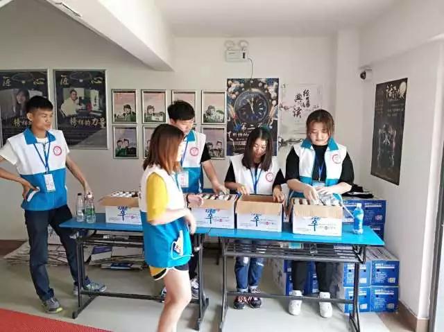 志愿者在休息室外分发矿泉水