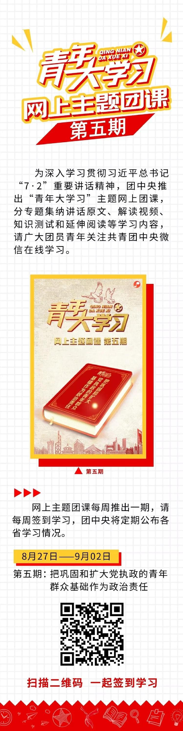 为深入学习领会习近平总书记“7.2”重要讲话精神,做一名合格党员,做一名有志青年,团中央推出“青年大学习”网上主题团课,第五期内容已经来啦——把巩固和扩大党执政的青年群众基础作为政治责任,划到图片最下方,扫描二维码,点击学习“青年大学习”网上主题团课。
