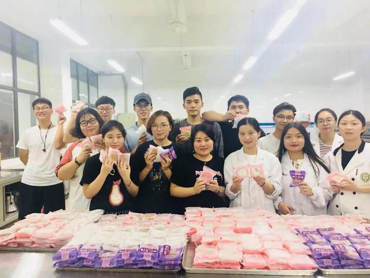 每个人都在自己负责的区域不紧不慢地制作。一盘一盘的广式月饼从烤箱里拿出来,一份一份的冰皮月饼放入冰箱,同学们一块一块的包装起来,就像是流水线操作一样。期间许多老师进来对同学们皆是称赞,小家属们也很乐意自己动手体验了一把从无到有的过程。