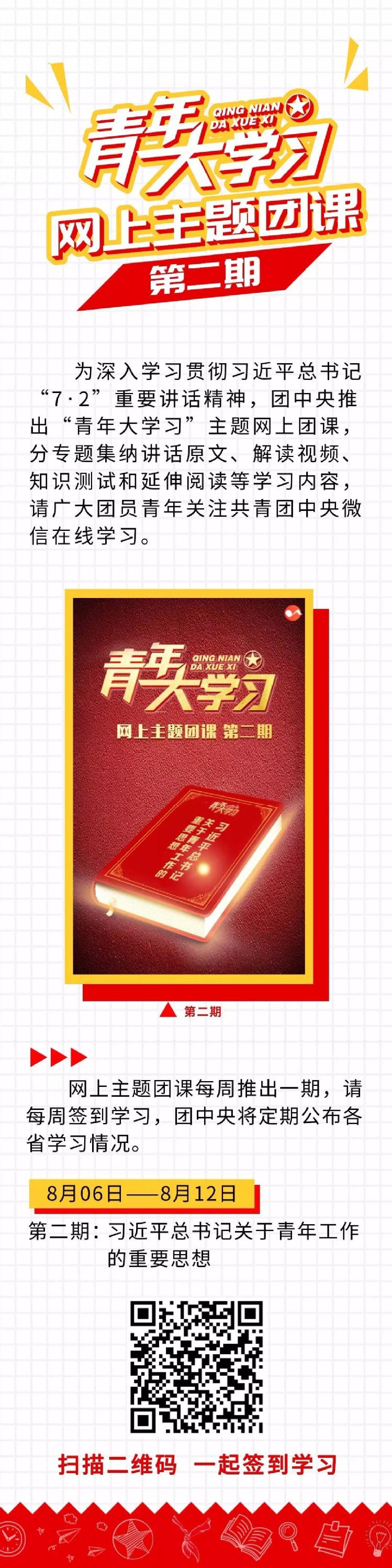 为深入学习领会习近平总书记“7.2”重要讲话精神,做一名合格党员,做一名有志青年,团中央推出“青年大学习”网上主题团课,第二期内容已经来啦——习近平总书记关于青年工作的重要思想,划到图片最下方,扫描二维码,点击学习“青年大学习”网上主题团课。