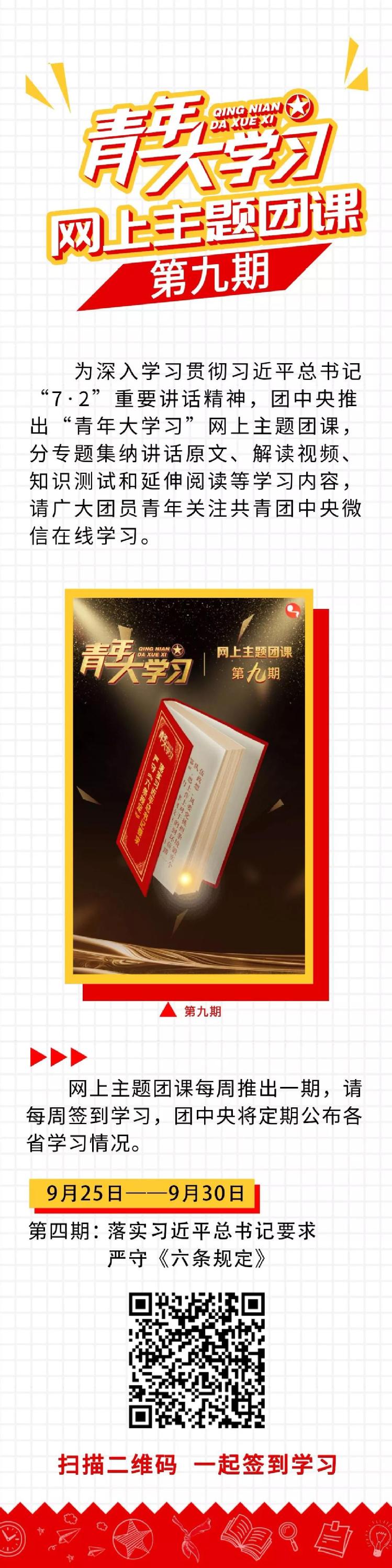 为深入学习领会习近平总书记“7.2”重要讲话精神,做一名合格党员,做一名有志青年,团中央推出“青年大学习”网上主题团课,第九期内容已经来啦——落实习近平总书记要求,严守《六条规定》,划到图片最下方,扫描二维码,点击学习“青年大学习”网上主题团课。