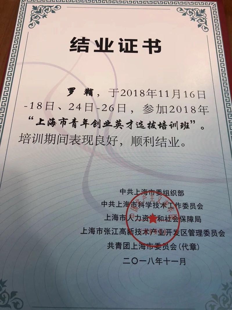 2018年“上海市青年创业英才开发计划”由中共上海市委组织部、中共上海市科学技术工作委员会、上海市人力资源和社会保障局、上海市张江高新技术产业开发区管理委员会、共青团上海市委员会等单位联合实施。“上海市青年创业英才开发计划”60名候选人参加为期6天的选拨培训。最终结合候选人的培训表现进行综合评分,研究提出30名上海市青年创业英才人选,报市人才工作协调小组审定。罗鞘同学也是本期选拨培训班中年龄最小的。