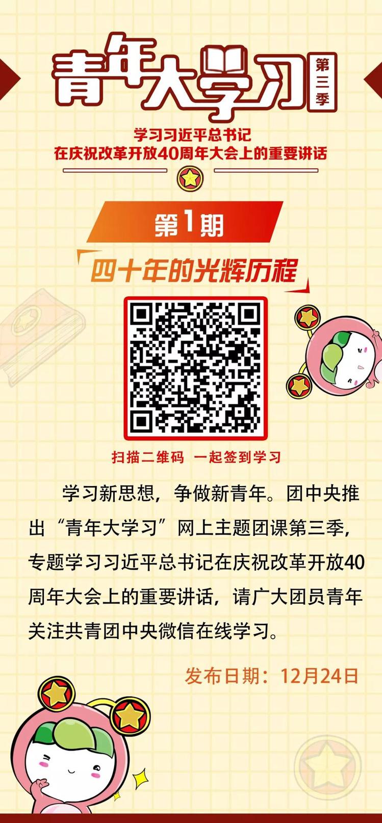 学习永远在路上。12月18日,中央召开了庆祝改革开放40周年大会,习近平总书记发表重要讲话。为了帮助广大团员青年及时准确地理解总书记的讲话精神,给大家准备了第三季“青年大学习”网上团课,分5期学习习近平总书记在庆祝改革开放40周年大会上的重要讲话。小伙伴们,快学起来吧!第三季内容已经来啦,点击学习“青年大学习”网上主题团课,学习第一期的主题:四十年的光辉历程。
