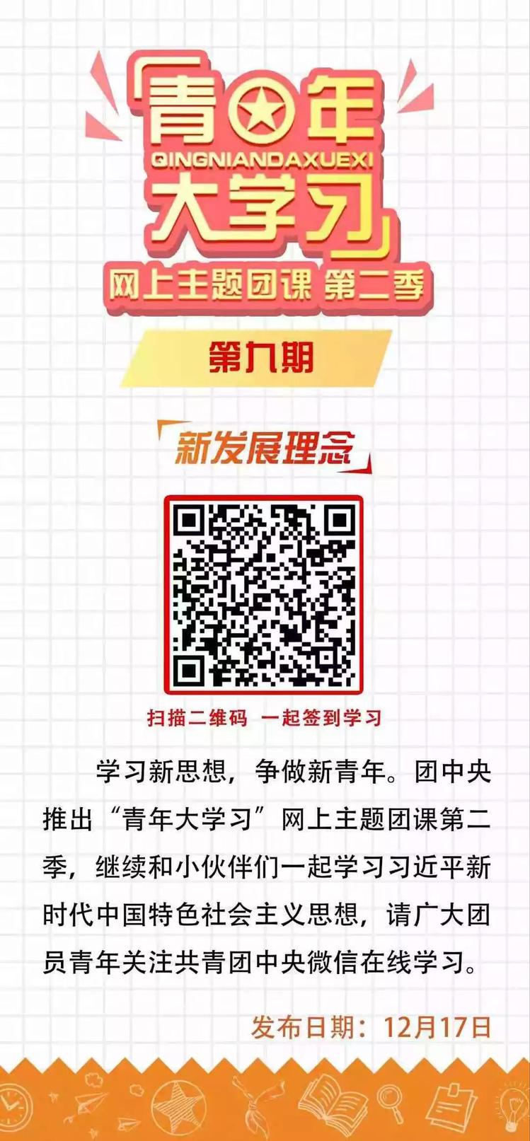 学习习近平新时代中国特色社会主义思想,是共青团员的义务和权利,是各级团组织最重要的工作。为深入学习习近平新时代中国特色社会主义思想中的一些“关键词”,学习新思想,争做新青年。团中央推出“青年大学习”网上主题团课,第二季内容已经来啦,划到图片最下方,点击学习“青年大学习”网上主题团课,学习第九期的主题:新发展理念。