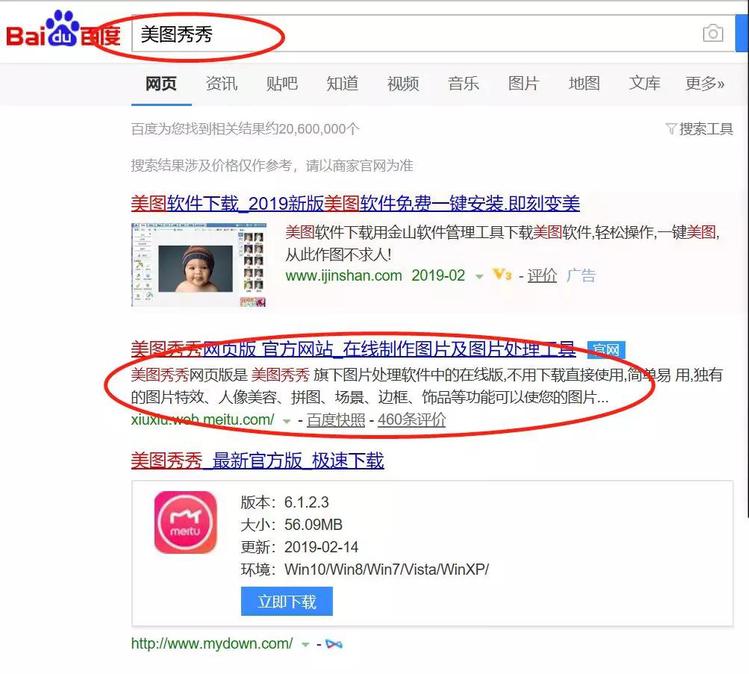 1.打开百度搜索“美图秀秀”,找到网页版,打开。