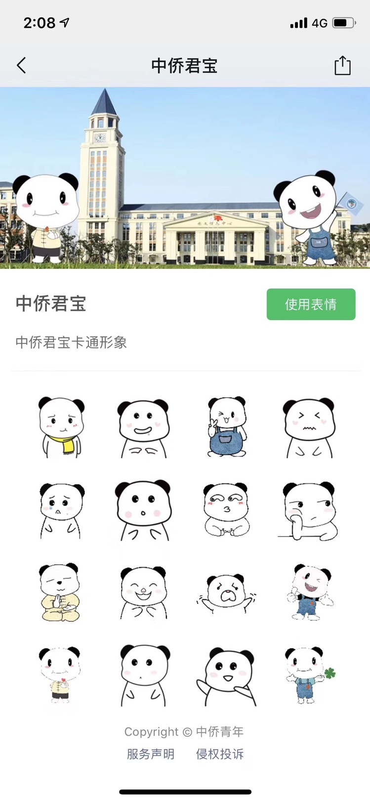 添加流程:打开微信,点击“我”→“表情”→搜索“中侨君宝”→下载→使用表情