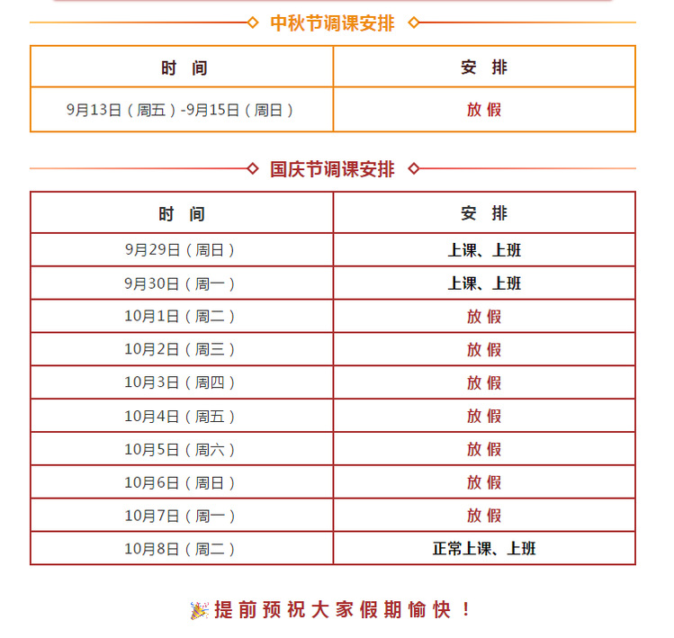 根据国务院办公厅关于2019年部分节假日安排的通知精神,结合我校实际,经校长办公会研究决定:一、中秋节的放假时间为9月13日(周五)至9月15日(周日),共3天。9月16日(周一)正常上班,上课。二、国庆节的放假时间为10月1日(周二)至10月7日(周一),共7天。9月29日(周日)教职工上班,学生补上10月4日(周五)的课。10月8日(周二)正常上班,上课。