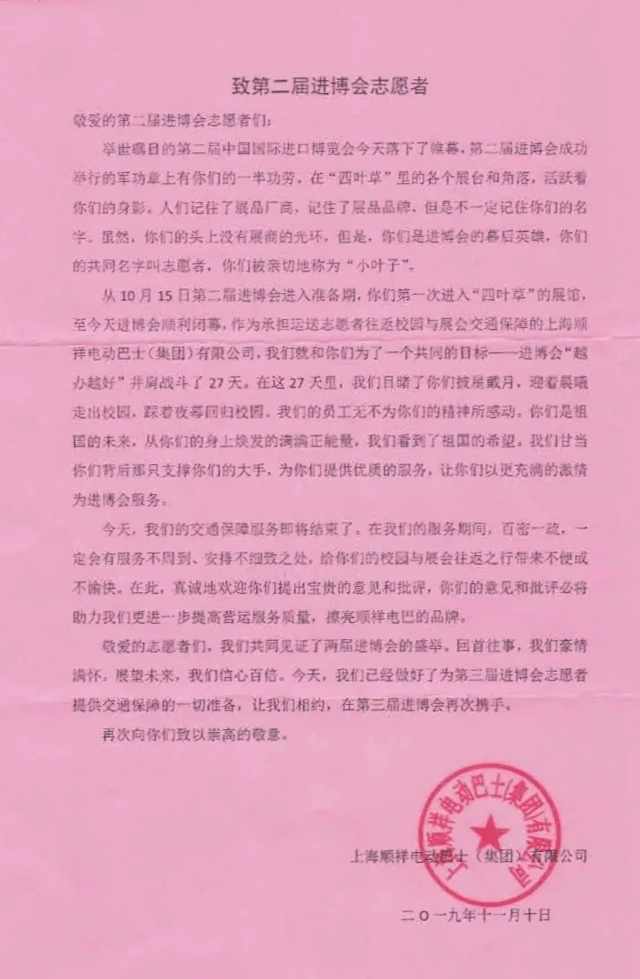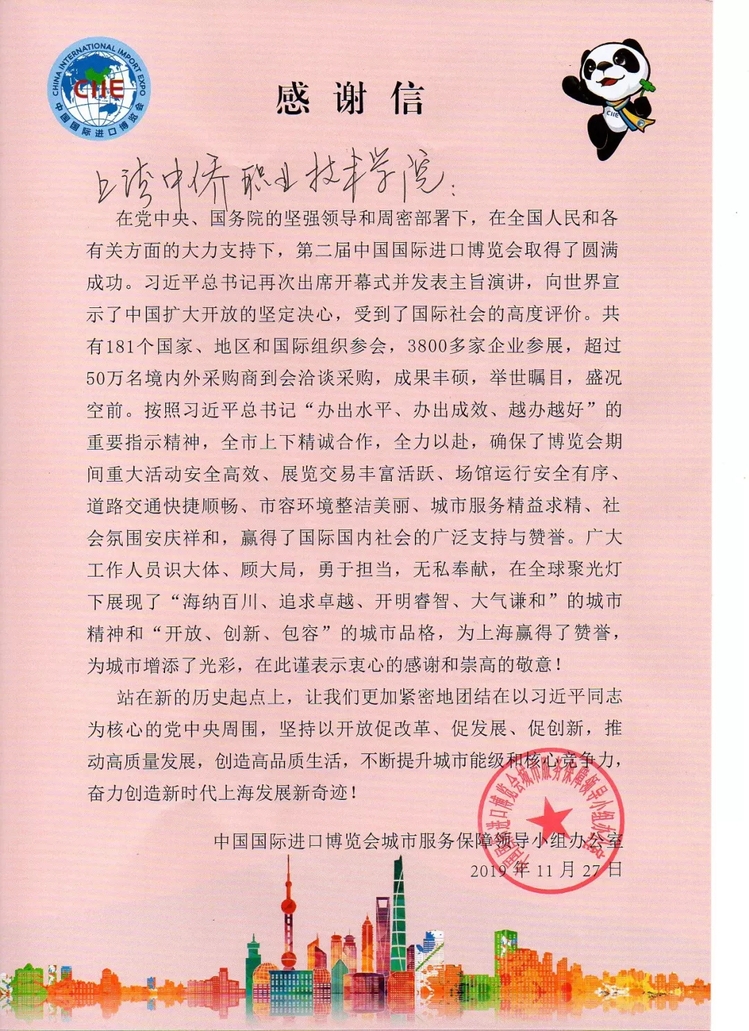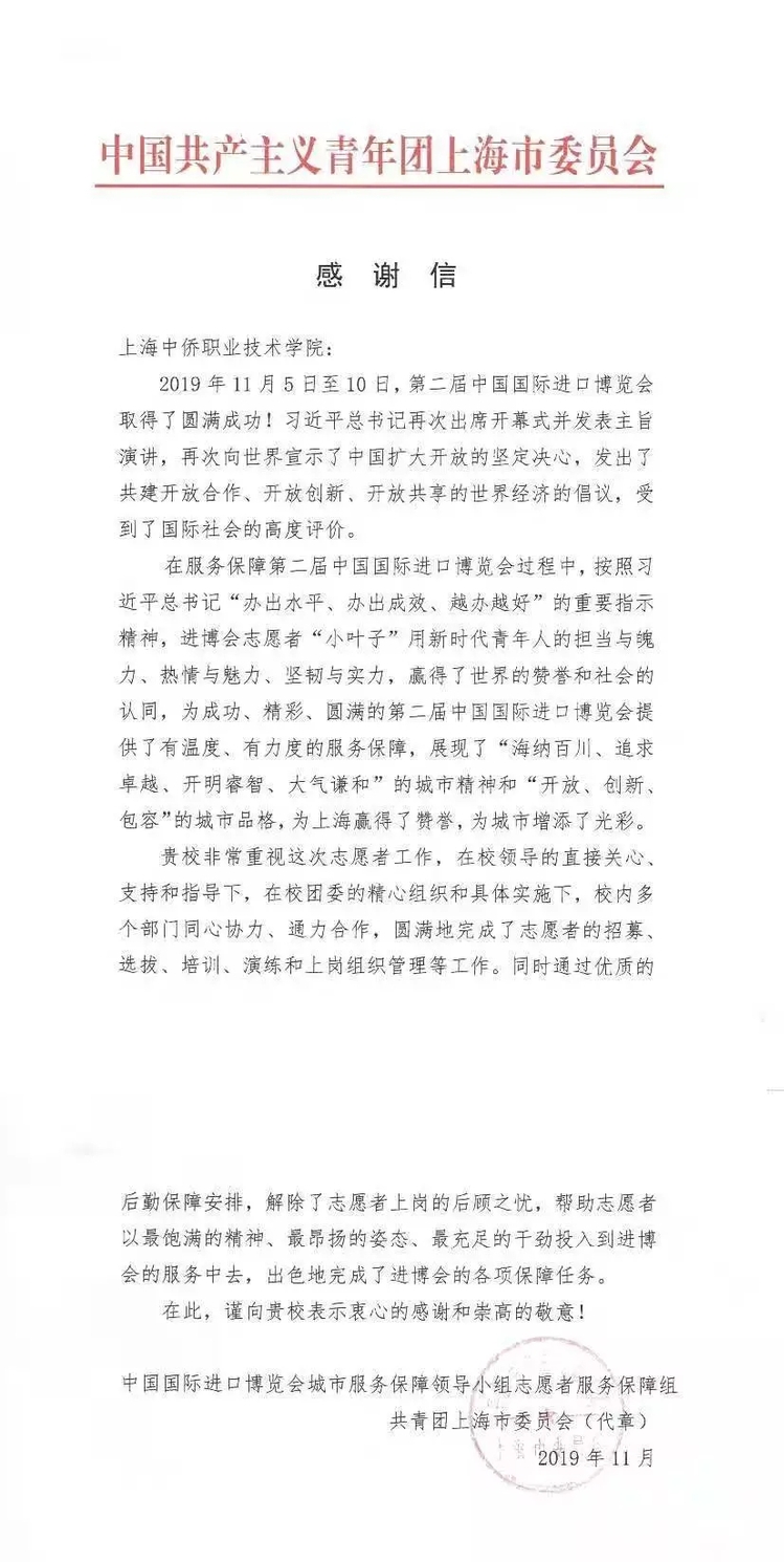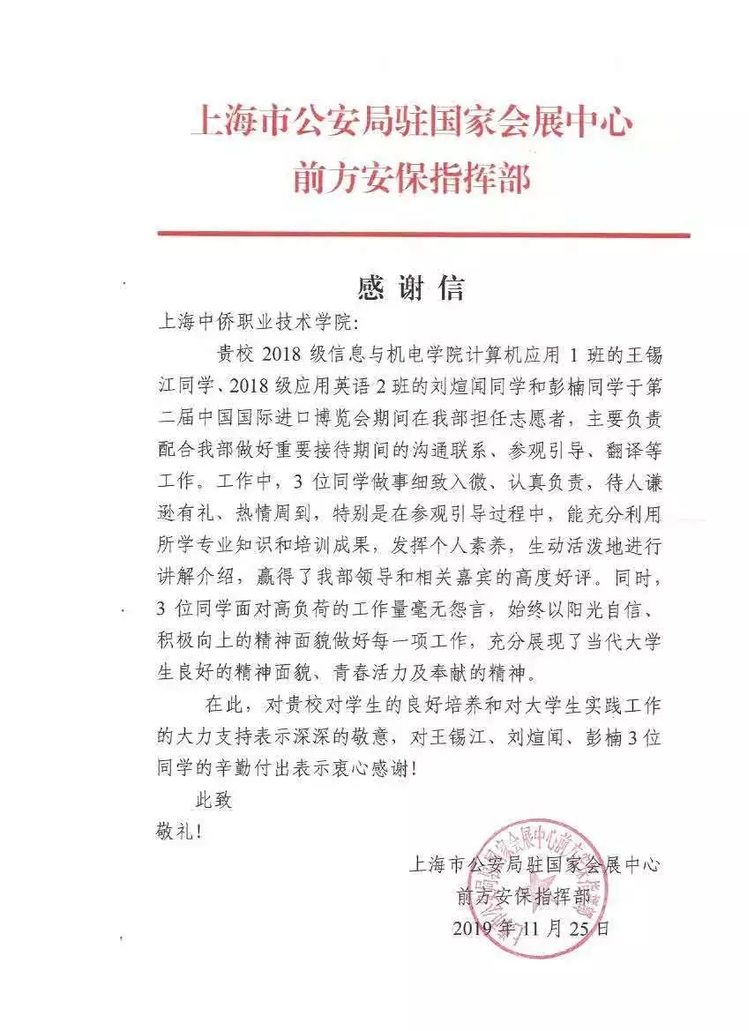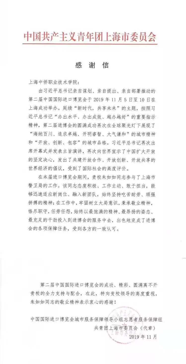 上海市警卫局为我校长期进博会志愿者朱如如发来感谢信