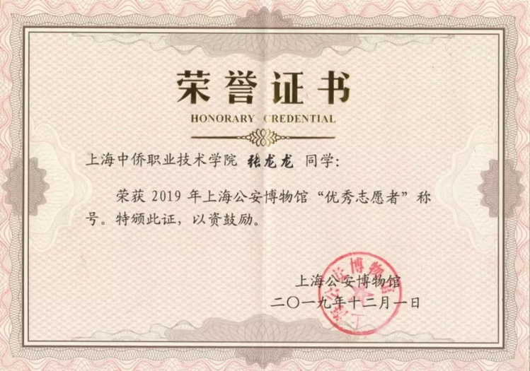 除了服务国家战略,我校青年志愿者还长期服务于场馆服务。在今年,我校三位同学获得上海市公安博物馆颁发的“优秀志愿者”称号。