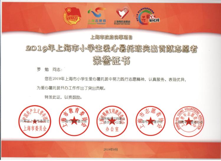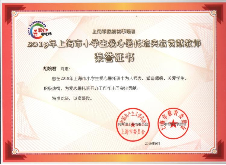 刘群、胡婉君等两名教师荣获2019年上海市小学生爱心暑托班突出贡献教师荣誉证书。