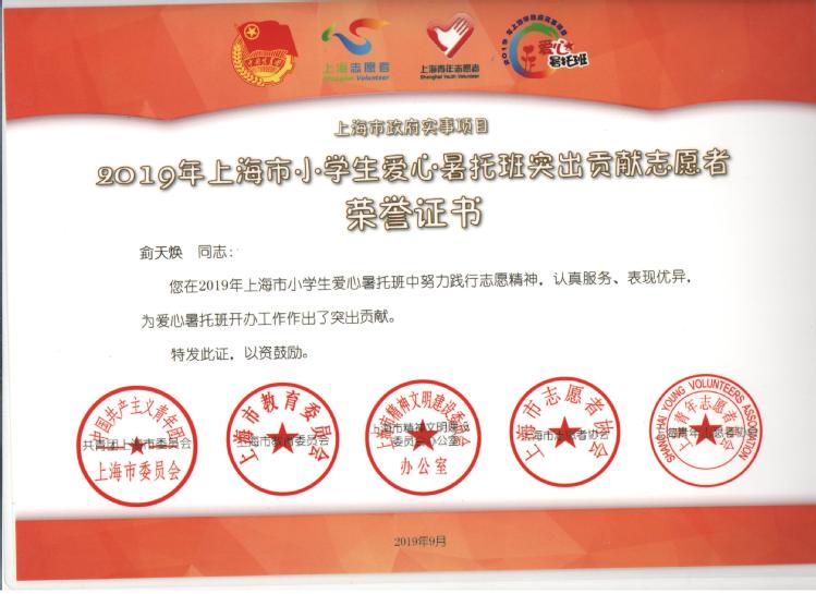 侴天焕、顾义玮、沈嘉敏、罗勉等四名同学荣获2019年上海市小学生爱心暑托班突出贡献志愿者荣誉证书。