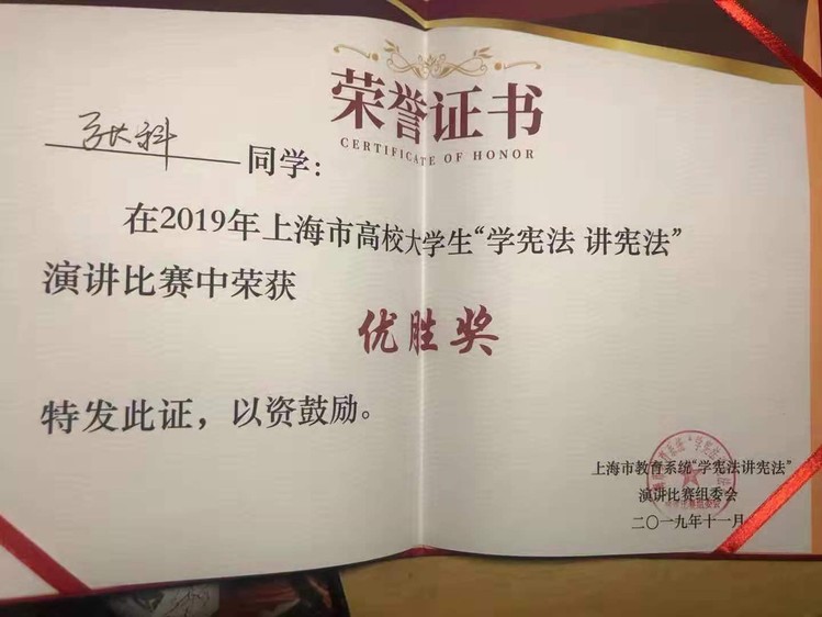 我校19级信息与机电学院 机电一体化专业张科同学荣获上海市高校大学生“学宪法 讲宪法”演讲比赛优胜奖。