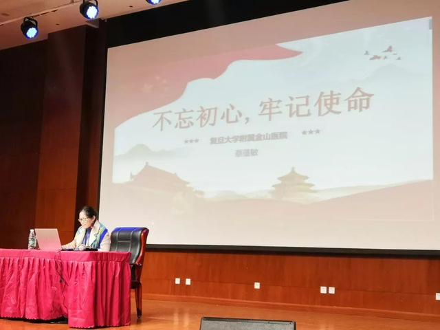 首先,蔡藴敏老师进行简单的自我介绍,蔡老师谦虚的说她只是复旦大学附属金山医院的一名普通护士,随后她说到党员的初心使命,说到作为一名医护工作者的医者本分。