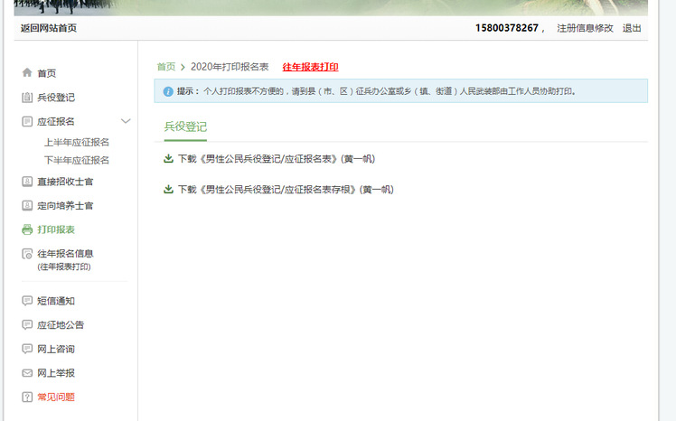 八.下载《男性公民兵役登记/应征报名表》与《男性公民兵役登记/应征报名表存根》交至各班辅导员。等返校开学后,经核对、审核后由二级学院统一打印。二级学院为班级单位装袋交武装部。
