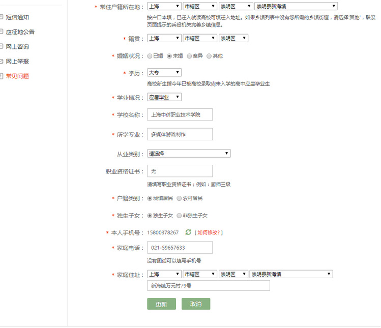 3.在做兵役登记时请特别注意最后的应征地:上海市--市辖区--金山区--上海中侨职业技术学院。