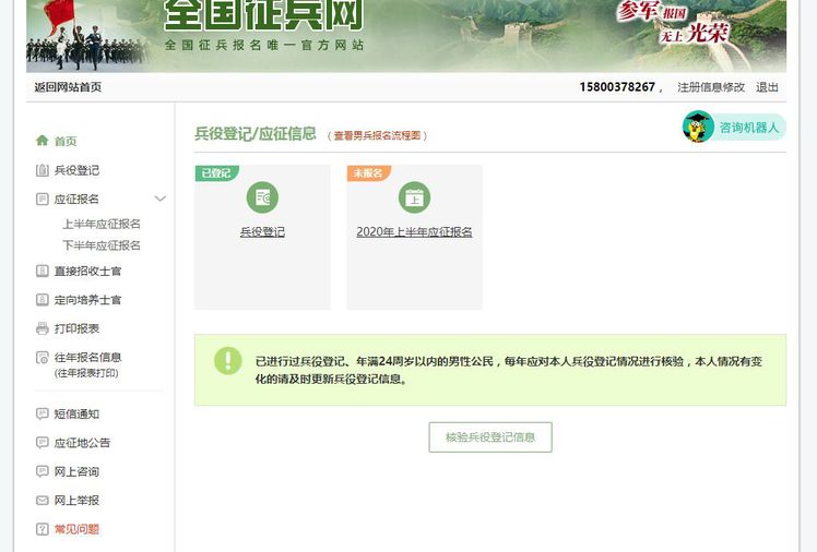 五.登录系统以后,点击“检验兵役登记信息”(新注册的点击“开始兵役登记”)进行登记工作。(下图为前者)
