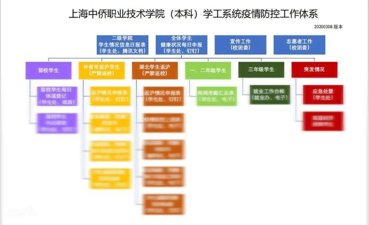 集中攻关后平台得以顺利上线。但为了实现科学、迅速、精准的疫情防控,学生处还是用起来的“土”办法,绘制了“七色图”,对留校学生、外省市返沪学生、重点地区返沪学生、居家隔离(观察)学生等工作程序用七色分别标识出来,并且根据疫情发展变化进行更新。