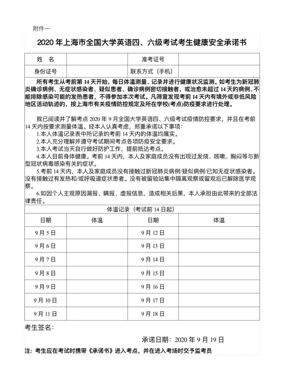 1.9月5日前,考生须在微信或支付宝完成本人“随申码”注册,同时下载打印《考生健康安全承诺书》(以下简称《承诺书》)(附件一),做好备考期间个人日常防护和健康监测,按要求如实、完整填写《承诺书》相关信息和健康数据并签字确认,考生对《承诺书》真实性负法律责任。