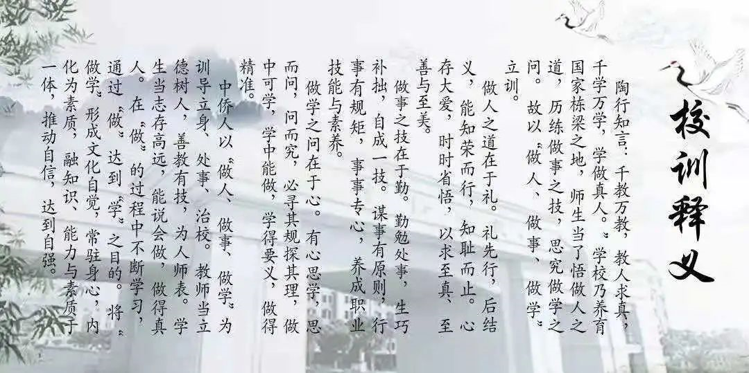陶行知言:“千教万教,教人求真;千学万学,学做真人。”学校乃养育国家栋梁之地,师生当了悟做人之道,历练做事之技,思究做学之问。故以“做人 做事 做学”立训。
