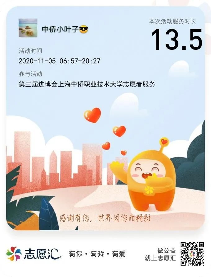 很荣幸能加入第三届国际进口博览会,成为一名光荣的小叶子,第一次参加这类国家盛会的志愿者活动,我感到十分紧张与激动,对我来说也是一次很好的锻炼机会和社会实践。我的岗位是证件验证引导,每天都会接触近上万人的证件验证。对我而言最大的一点感受可能就是在服务期间与一些外国友人的交流,让我深刻意识到了掌握好外语的重要性。虽然我们后面几天可能很辛苦,都是早出晚归,但对于我们中侨学子来说在之后这些天里的收获的一切却是以后可能都不会有的。