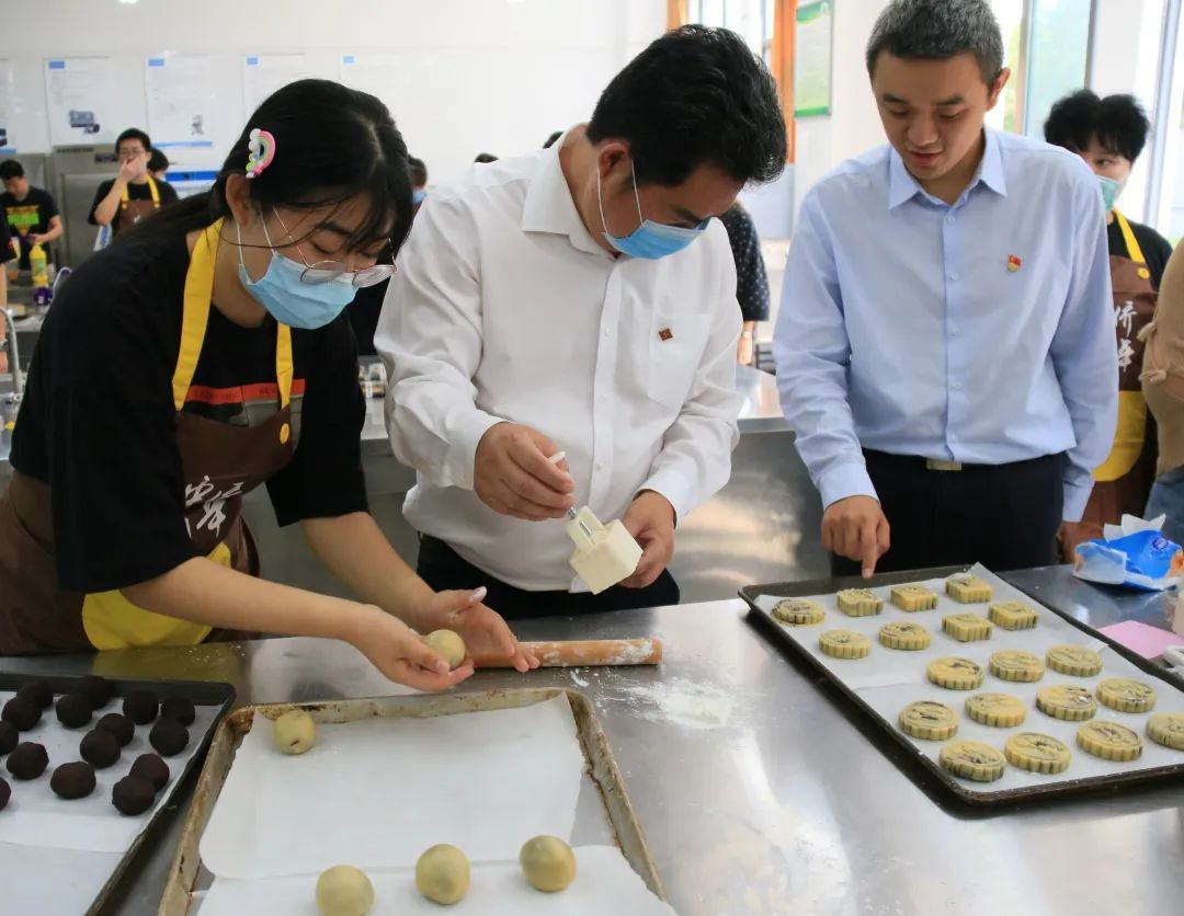 校长陈晓斌得知留校学生在校体验做月饼,特地前往食品药品学院,与在校学生一同参与制作月饼。并为中侨青年月饼代言,中侨月饼,谁吃了都说好。