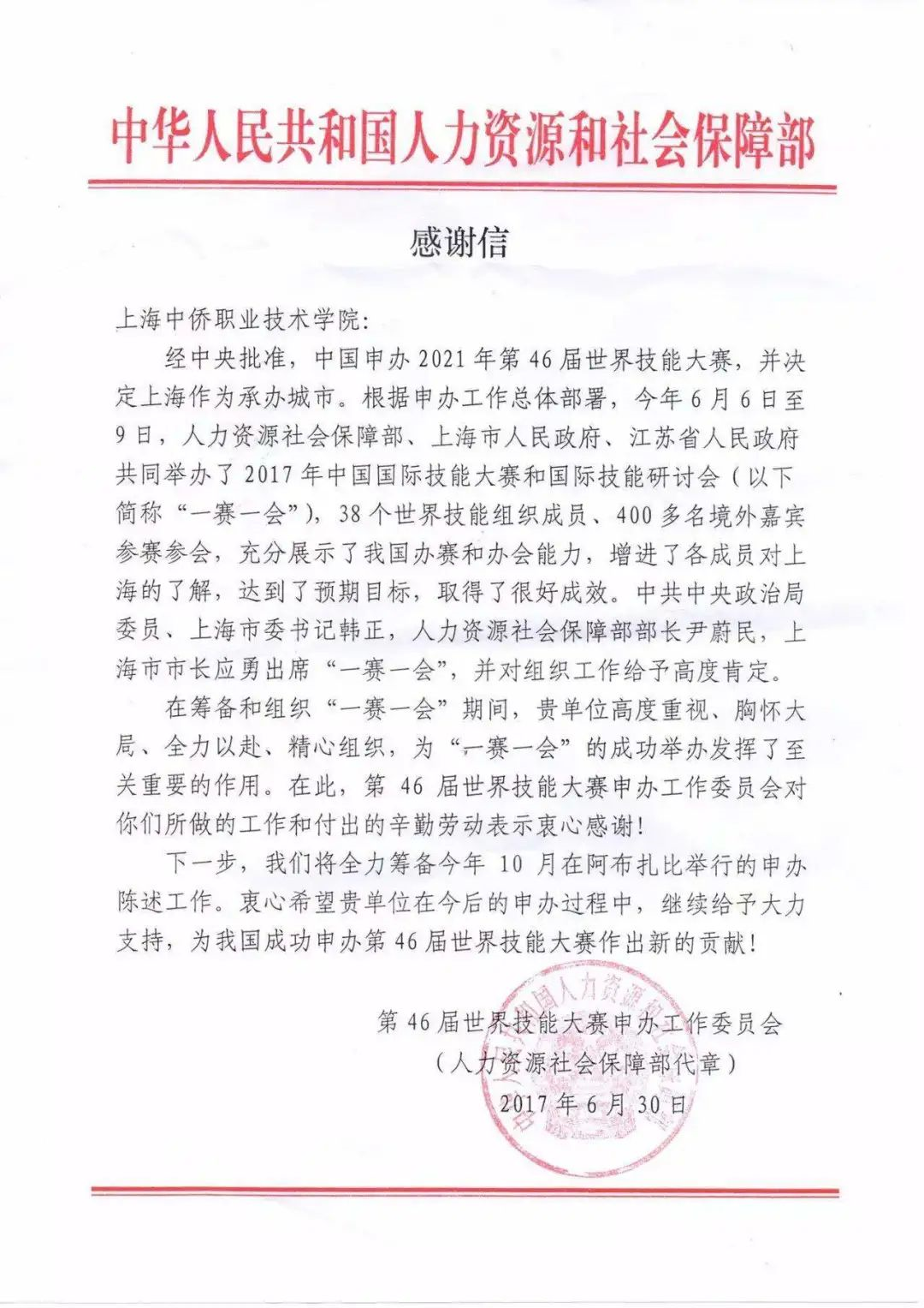 2017年中国国际技能大赛在上海举行。这也是新中国成立以来最大规模的国际技能赛事。6月6日-9日,中侨大学173名青年志愿者参与到该项志愿服务工作。他们分别负责注册接待、开闭幕式、安全保障组等志愿工作。时任团中央书记处书记汪鸿雁看望慰问了此次大赛的我校志愿者代表。国家人力资源和社会保障部和第46届世界技能大赛申办工作委员会的感谢信。