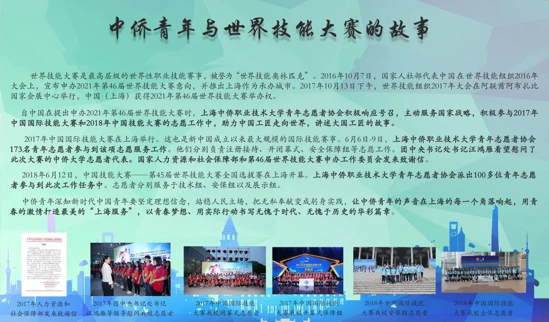 自中国在提出申办2021年第46届世界技能大赛时,上海中侨职业技术大学青年志愿者协会积极响应号召,主动服务国家战略,积极参与2017年中国国际技能大赛和2018年中国技能大赛的志愿工作中,助力中国工匠走向世界,讲述大国工匠的故事。