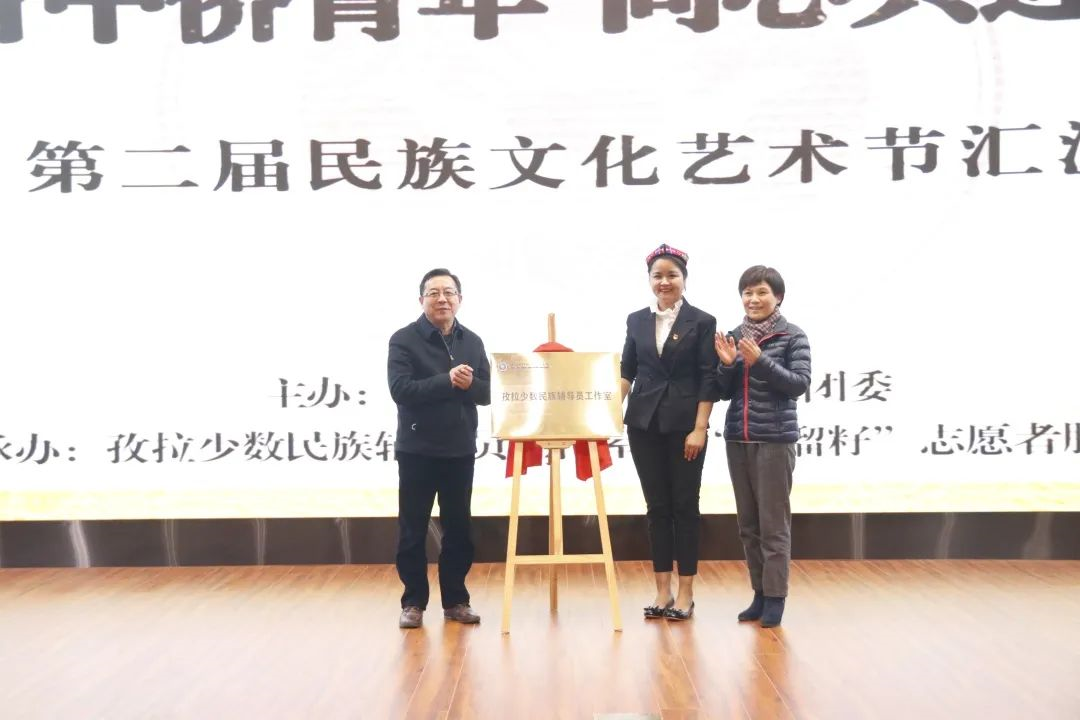 金山区委统战部副部长、区民宗办主任陆美观和我校党委副书记、副校长管琰琰为“孜拉少数民族辅导员工作室”揭牌。