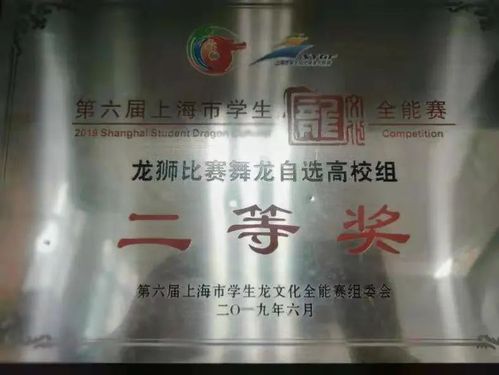 2019年6月第六届上海市学生龙文化全能赛龙狮比赛舞龙自选高校组二等奖;2019年6月第六届上海市学生龙文化全能赛龙狮比赛舞龙传统高校组三等奖;2019年上海城市业余联赛“城建杯”上海市第三节舞龙邀请赛舞龙自选三等奖。