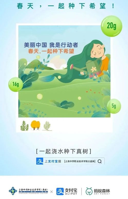 为了践行绿色环保中国理念,上海中侨职业技术大学和支付宝蚂蚁森林联手行动。在这场行动里,每个人都不只是环境的围观者,每个人都可以参与环境的改变。