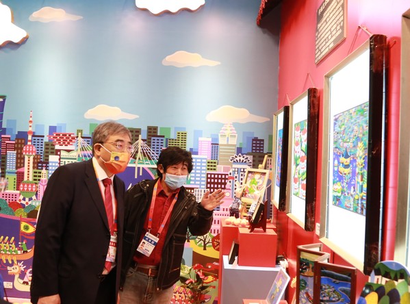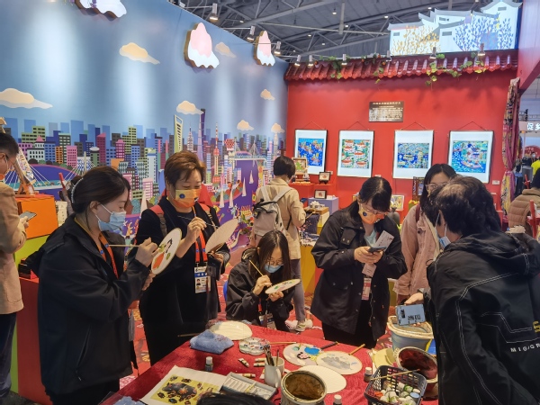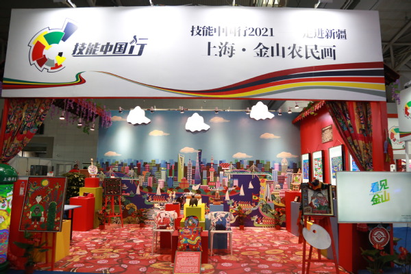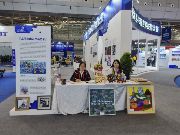 受上海市和金山区人力资源社会保障局委托,我校艺术学院金山农民画大学生艺术工坊也在全国舞台闪亮登场!本次展出的金山农民画除经典的农民画作品外,还以文创产品的形式展出。裸眼3D、冰箱贴、瓷盘、充电宝、团扇、抱枕等都画有色彩艳丽的农民画作品。吸引了不少嘉宾、选手、教练、裁判等前来观看。