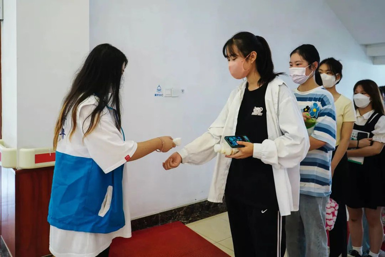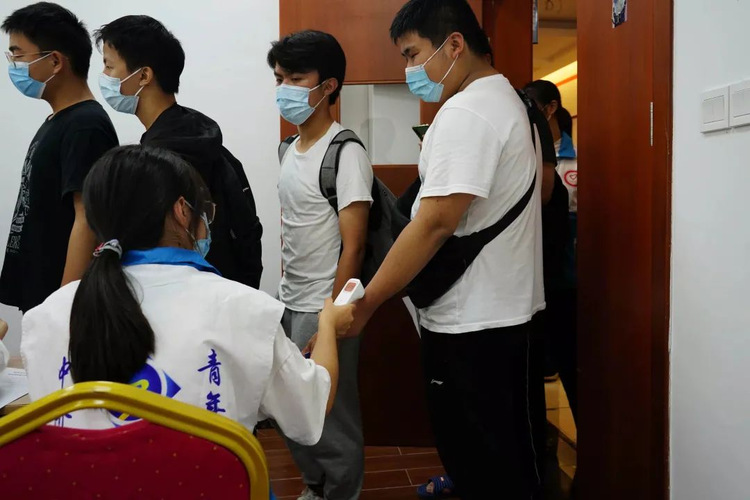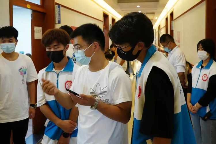 同学井然有序地测温入场。活动现场有五个区域,分别是登记区、体检区、献血区、休息区、领证区。