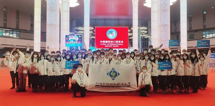 上海中侨职业技术大学青年志愿者作为第四届进博会高校代表上台重温入党誓词、入团誓词,并接受赠送装备。