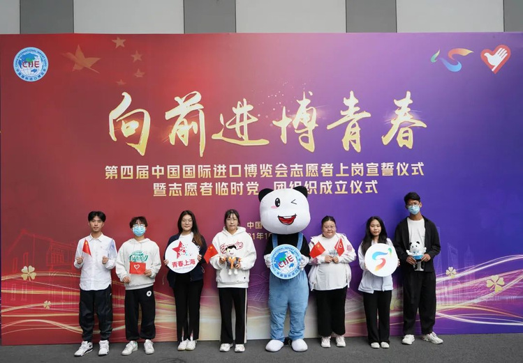 2021年10月20日上午,“向前进·博青春”第四届中国国际进口博览会志愿者上岗宣誓仪式暨志愿者临时党、团组织成立仪式在国家会展中心(上海)虹馆举行。