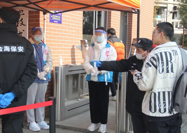 同学们在志愿者的帮助下查码进入校园,志愿者们核验返校同学信息,志愿者们帮助同学测量体温,同学们在志愿者的帮助下秩序井然。