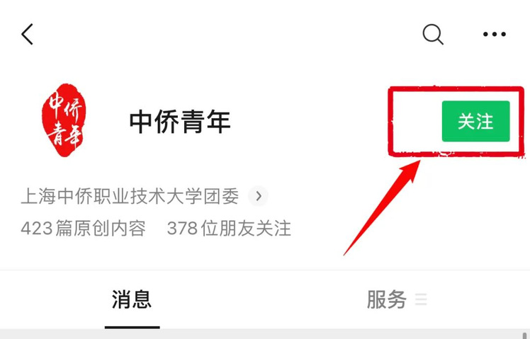 1.查找“中侨青年”公众号:打开并关注公众号。