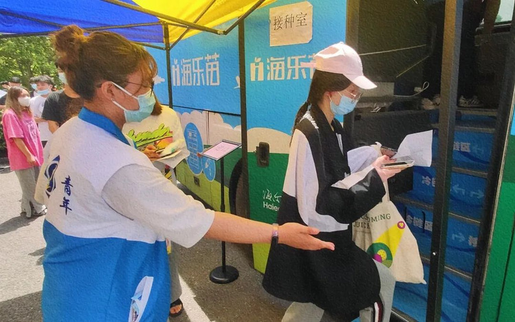 “请大家拿出准备好的材料,排好队伍耐心等待,谢谢。” 引导区志愿者们有序引导同学上车接种。