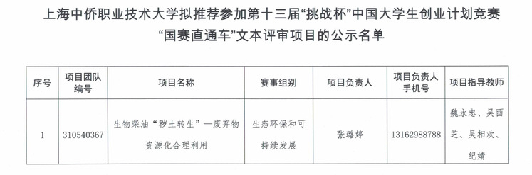 根据第十三届“挑战杯”中国大学生创业计划竞赛有关安排,经“国赛直通车”活动选拔,现对上海中侨职业技术大学拟推荐参加第十三届“挑战杯”中国大学生创业计划竞赛“国赛直通车”文本评审的1个项目进行公示。