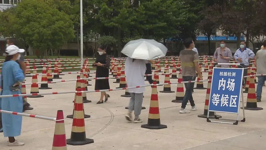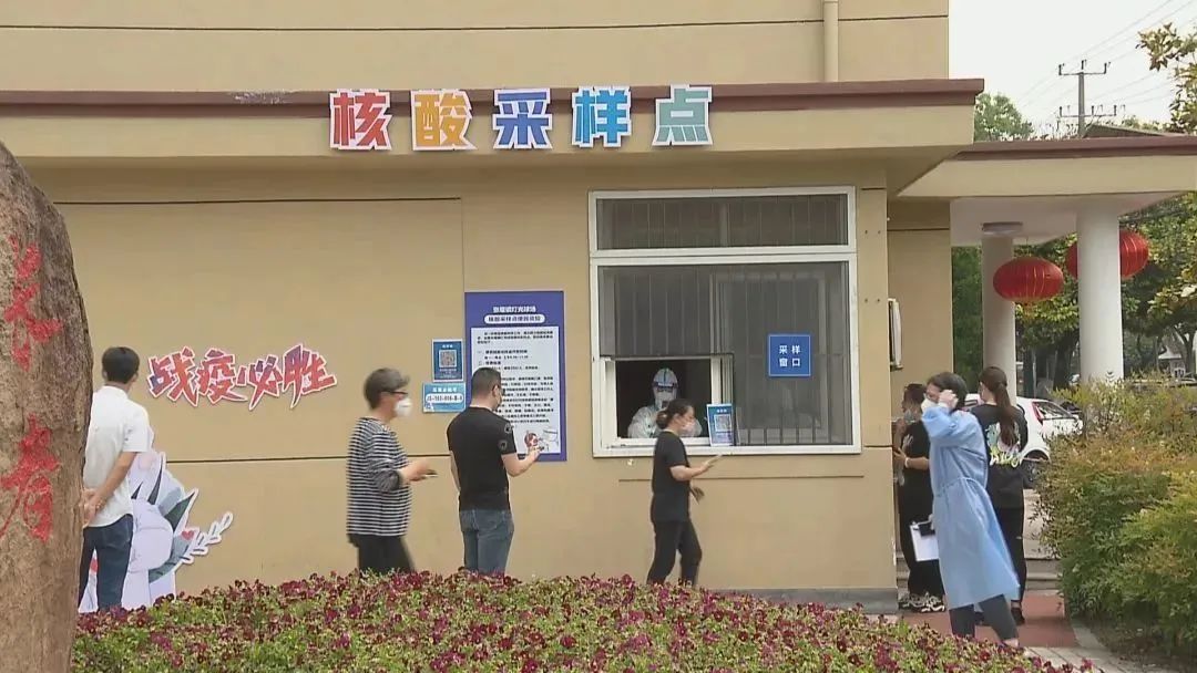 在张堰镇灯光球场核酸采样点,四名身着防护服的大学生志愿者们分成两队,一队负责核酸采样扫码登记,另一队负责现场引导、分流待检人员以及协调现场秩序。