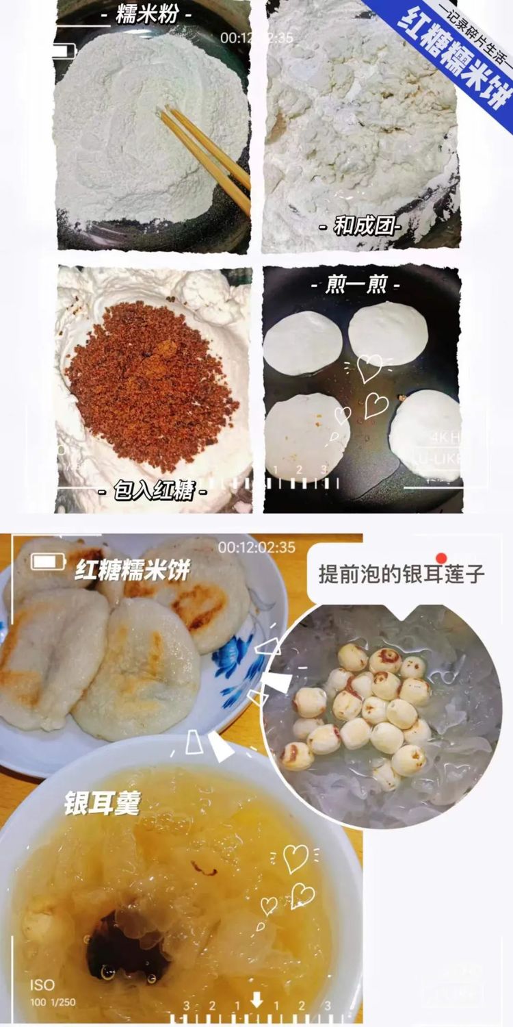今天早上我早起半小时为家人做了一顿早饭:红糖糯米饼和银耳羹。先将糯米粉和成团,随后包上红糖,放入锅中煎一煎,甜香软糯的糯米饼就做好了。再将前一天晚上提前泡好、炖好的银耳羹盛出一碗。健康又营养的早饭,让一家人在疫情期间一起感受美食带来的幸福~