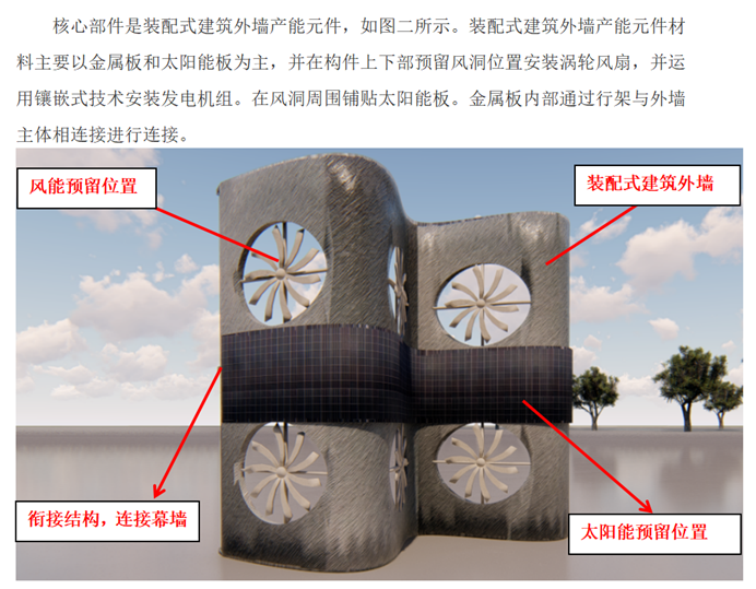 本项目设计了一套基于BIM的装配式建筑外墙(光伏+风能建筑外墙一体化模型系统),将太阳能板和风扇与装配式建筑外墙进行结合,形成光伏+风能建筑外墙一体化模型系统。产品利用了光电效应原理,通过太阳能板,实现将太阳辐射能直接转换成电能。并利用了风力发电原理,通过风力带动风扇叶片旋转和增速机将速度提升,来促使发电机发电。可以实现风能与太阳能的最大利用化。