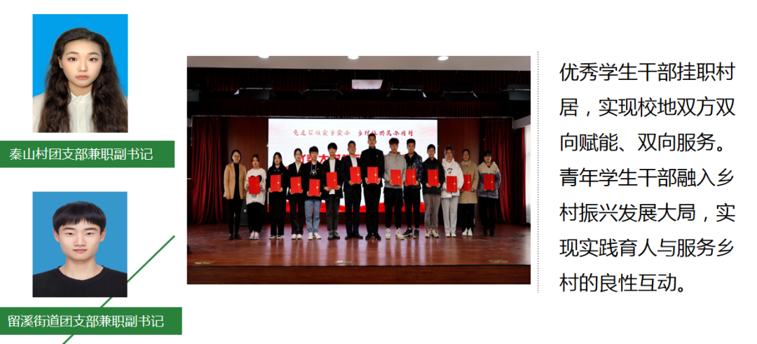 青年学生村居挂职:信息工程学院分团委依托组织优势,与秦山村和留溪街道开展校村团支部结对,推荐青年学生挂职村居,开启校地双方双向赋能、双向服务新局面,实现实践育人与服务乡村的良性互动。