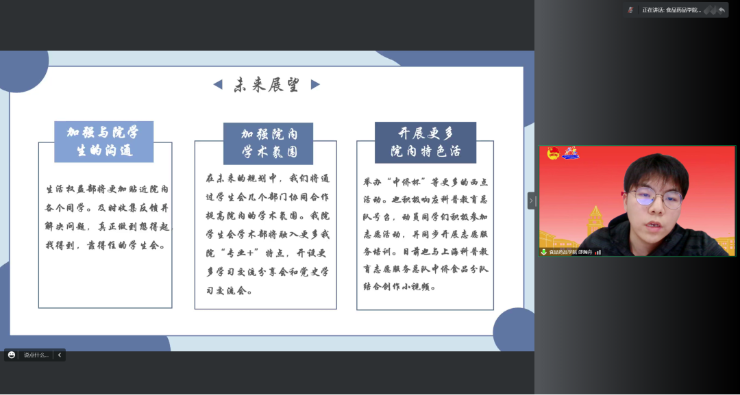 邵瀚舟同学从“我为同学做实事”、专业“+”活动、未来展望三个部分汇报了食品药品学院学生会具体工作,并表明今后将增强学生会干事的工作培训,传达“学有余力”、“全新全意为同学服务”等思想,为后续工作质量提供保障。同时加强校与院、院与院的沟通交流,及时收集、反馈并解决问题,更好的加深情谊。